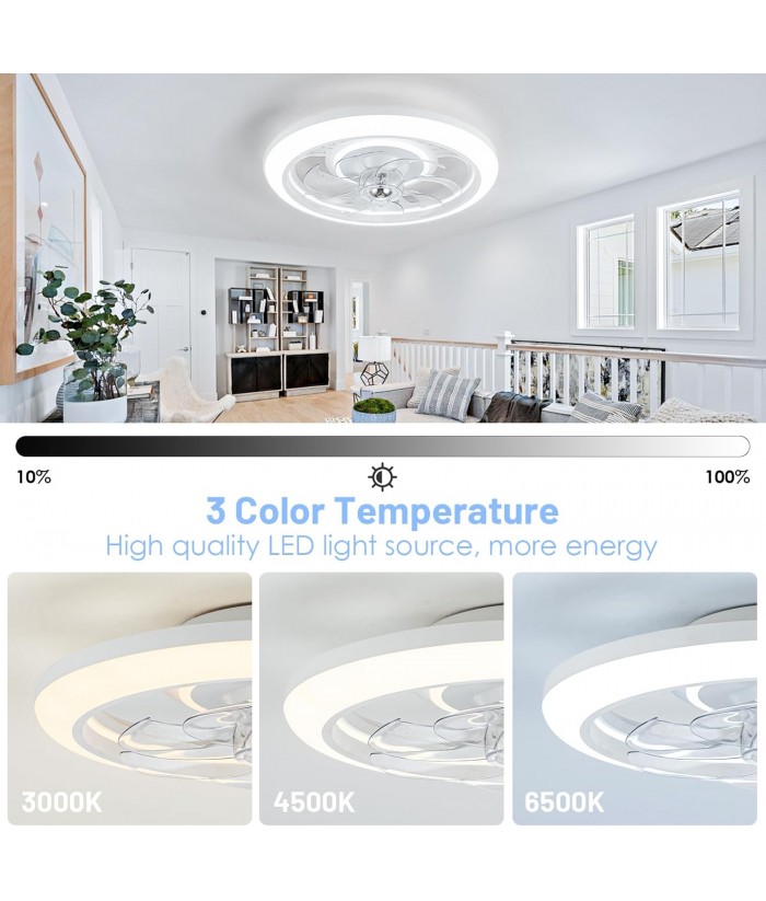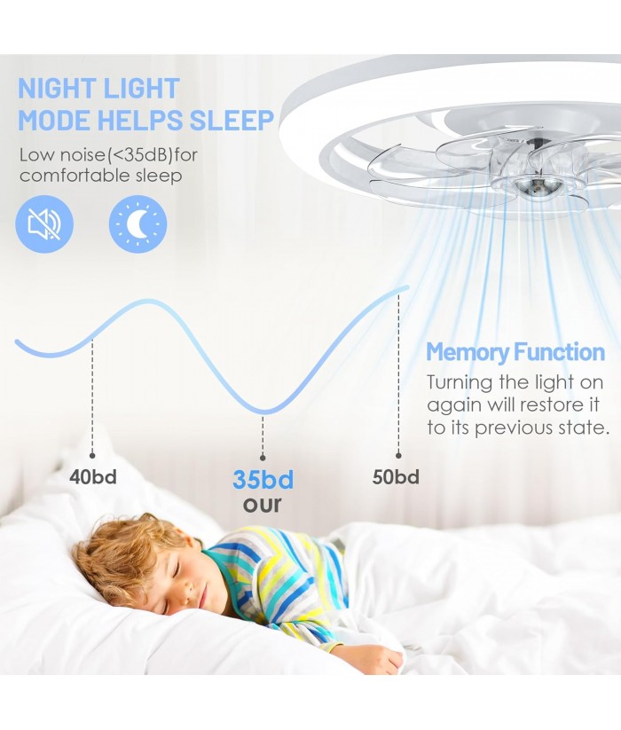 Adjustable Ceiling Fan: The color temperature (3000-6500K) and brightness (10-100%) of this silent ceiling fan are adjustable, meeting your different needs. In addition, the memory of the ceiling fan light with light and remote control will return to the previous state the next time it is turned on, making it convenient. The LED light source is equipped with an eye-protecting acrylic lampshade, providing glare-free and flicker-free operation.