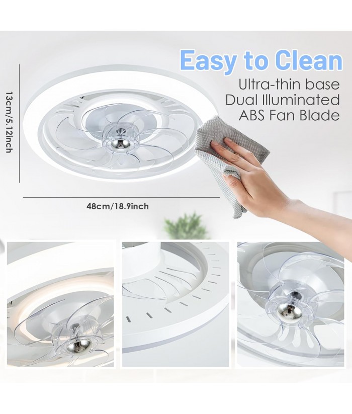 Super Slim Ceiling Fan: A ceiling fan with light that meets modern aesthetics, with an ultra-slim base to save space. Easy to install and clean. Ceiling fans with light feature an inner and outer ring luminous design, enhancing the light source and making your interior decor elegant and inspiring. Our silent ceiling fans with light are widely used in bedrooms, living rooms, kitchens, studies, and more.